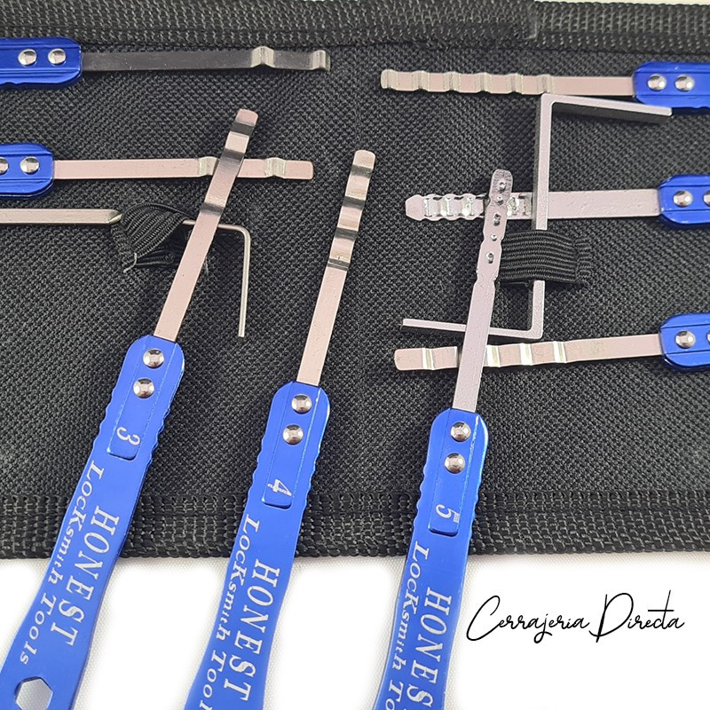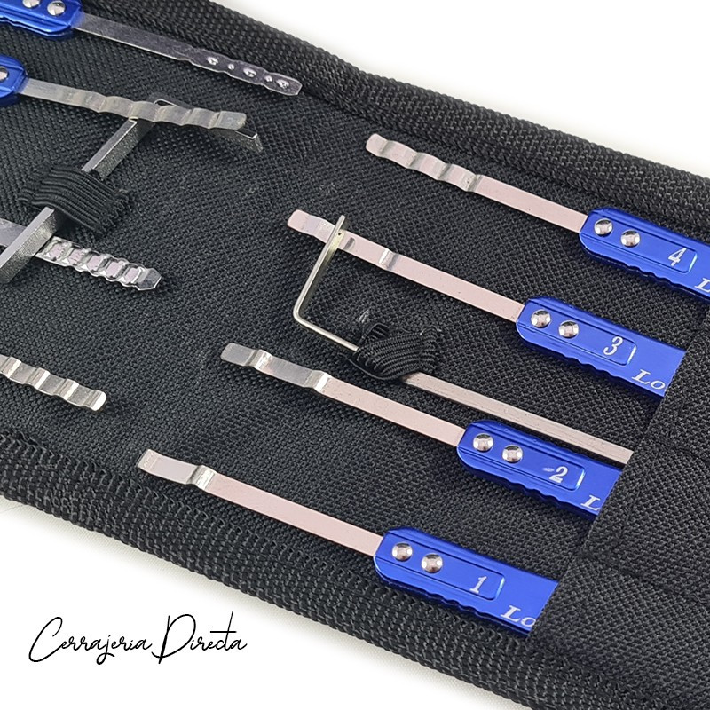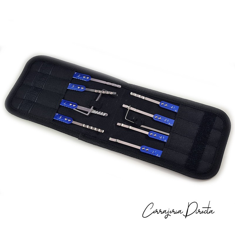 Incluye 8 ganzúas y dos tensores en un práctico estuche de tela con velcro bordado para su fácil transporte.